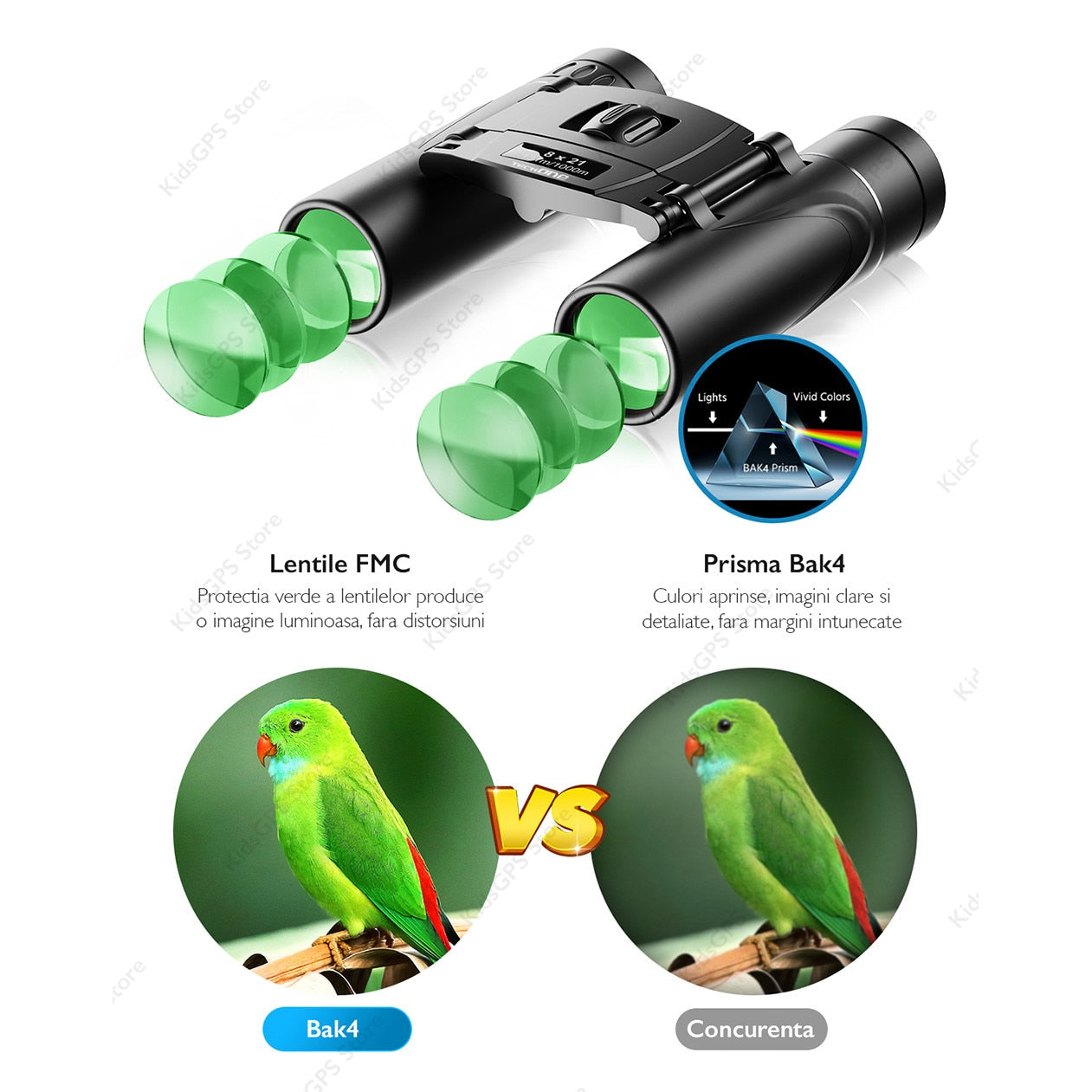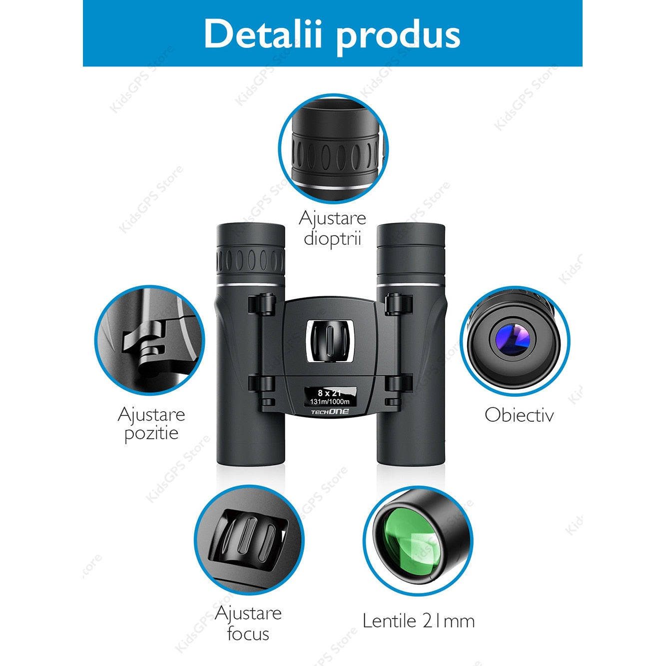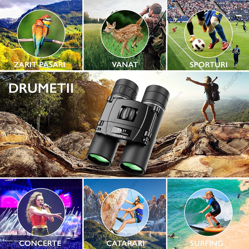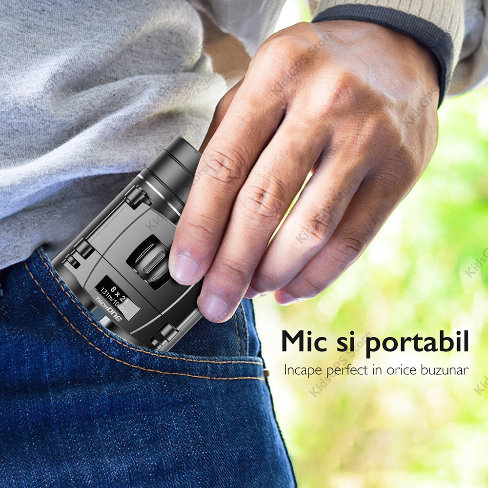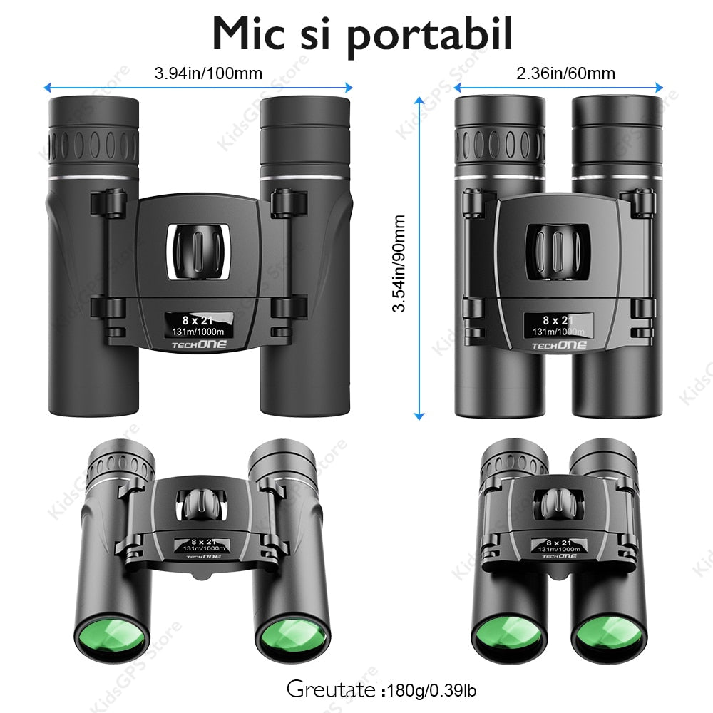 Binoclu profesional 8 x 21 Techone® Hunter, ultra portabil, pliabil, lentile Premium FMC, prisma BAK 4, husa depozitare pentru curea, pentru vanatoare, pasari, calatorii, turism, negru