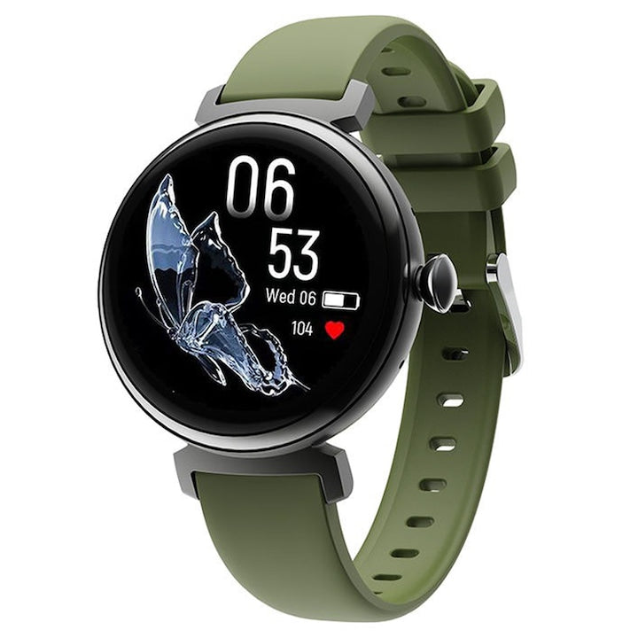 Ceas smartwatch femei TechONE® DM70 Tiny Me, AMOLED 1.04 inch, Apel Bluetooth 5.0, Monitorizare Ciclu, Oxigen, Ritm Cardiac, Vremea, Notificari, Metalic, Sporturi Multiple, Negru Silicon Verde