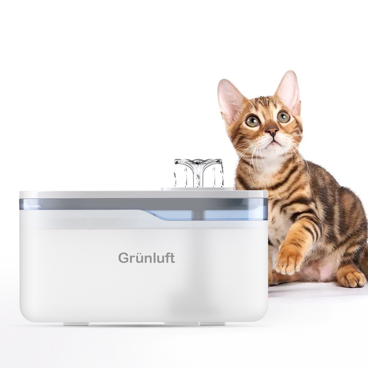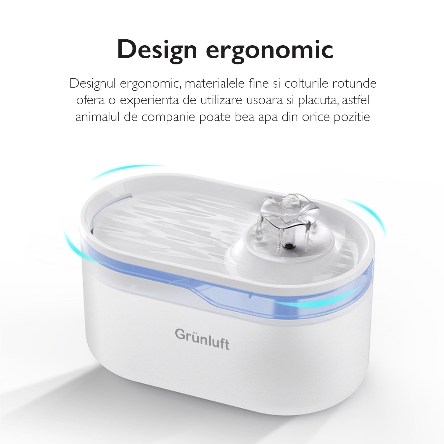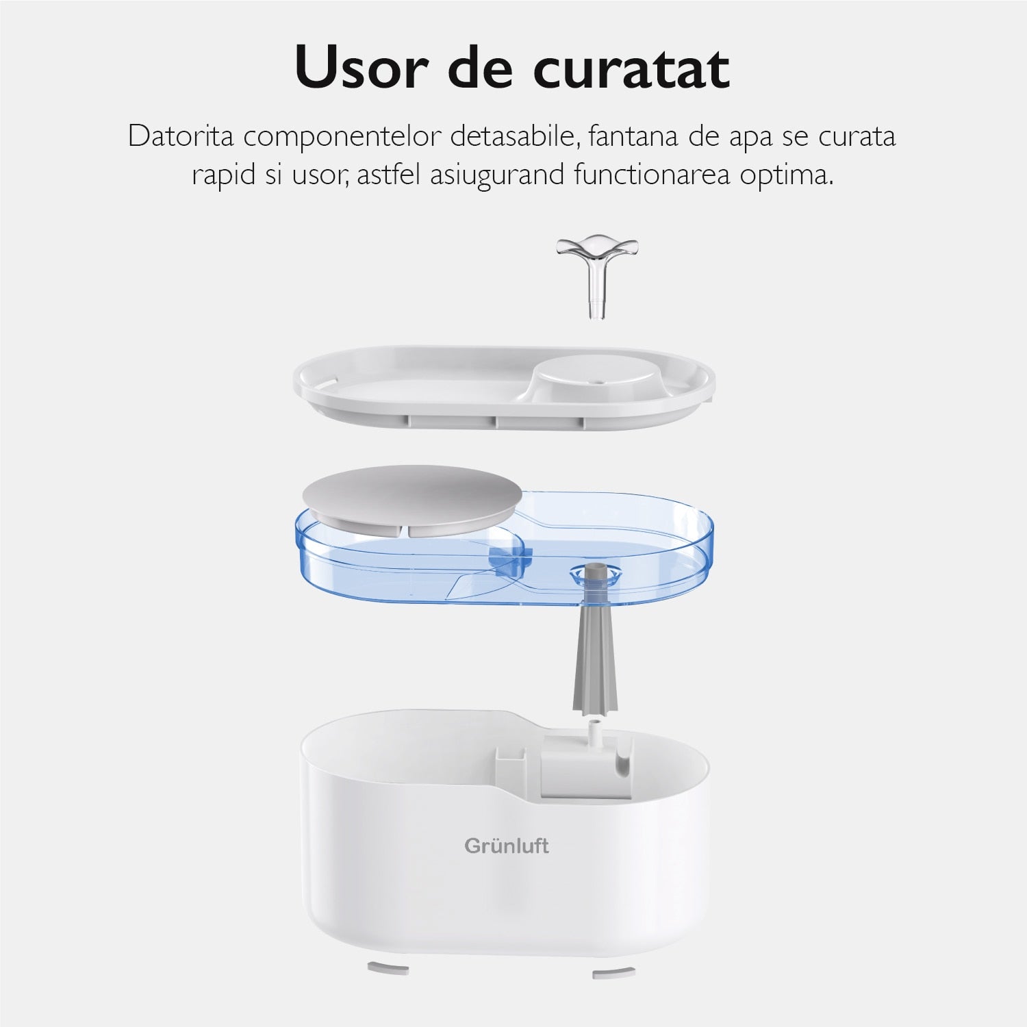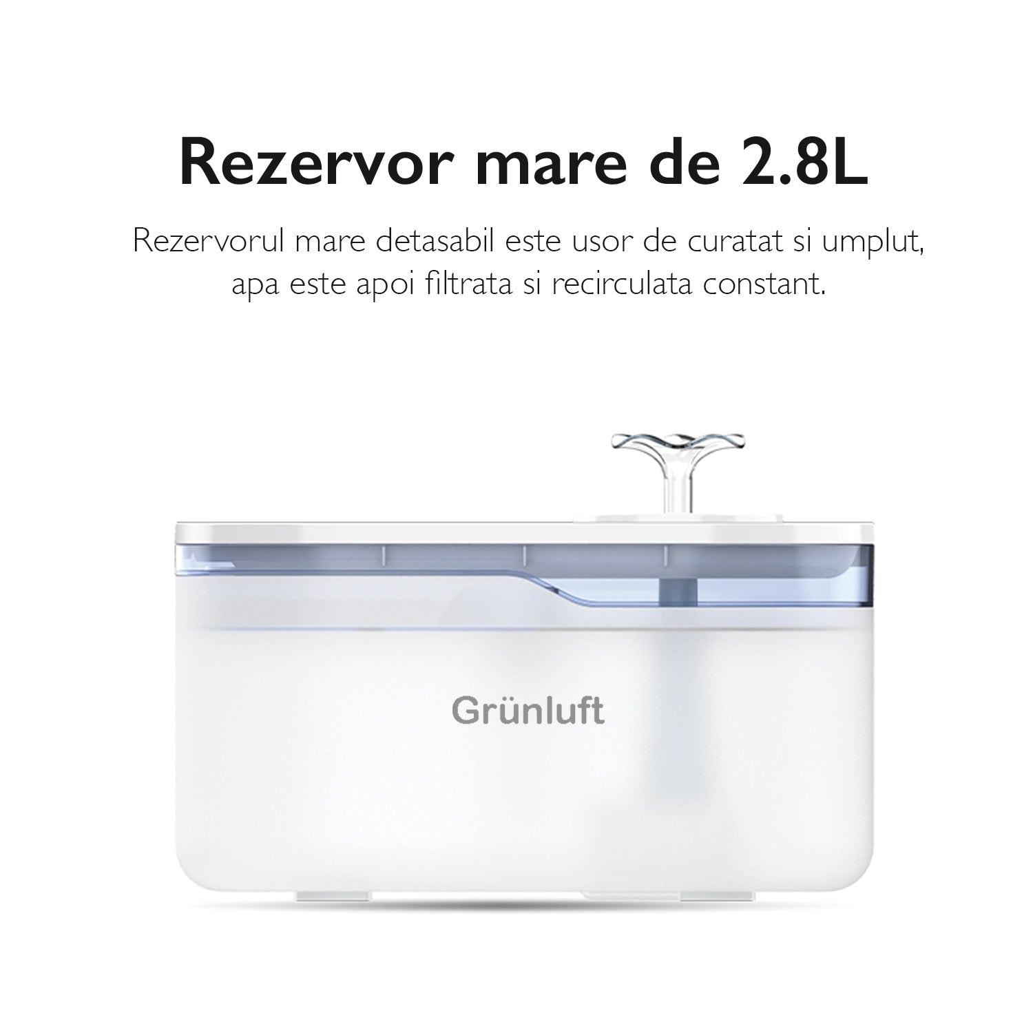 Dispenser apa automat Grunluft® WF006 tip adapator fantana pentru pisici si caini, ultra silentios, 2 moduri fantana, sistem recirculare si filtrare carbon activ 5 trepte, 2.8 L, adaptor priza, alb