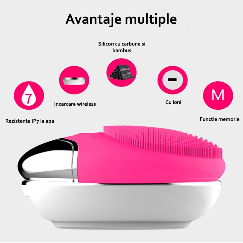 Dispozitiv de curatare faciala, Horigen™ DeepClean Pro V4, 5 viteze, 12000 oscilatii/min, cu carbune-bambus, viteza ajustabila, acumulator 300mAh, suport incarcare wireless, rezistent la apa, 3 zone de curatare, tehnologie cu ioni negativ, capat masaj, roz