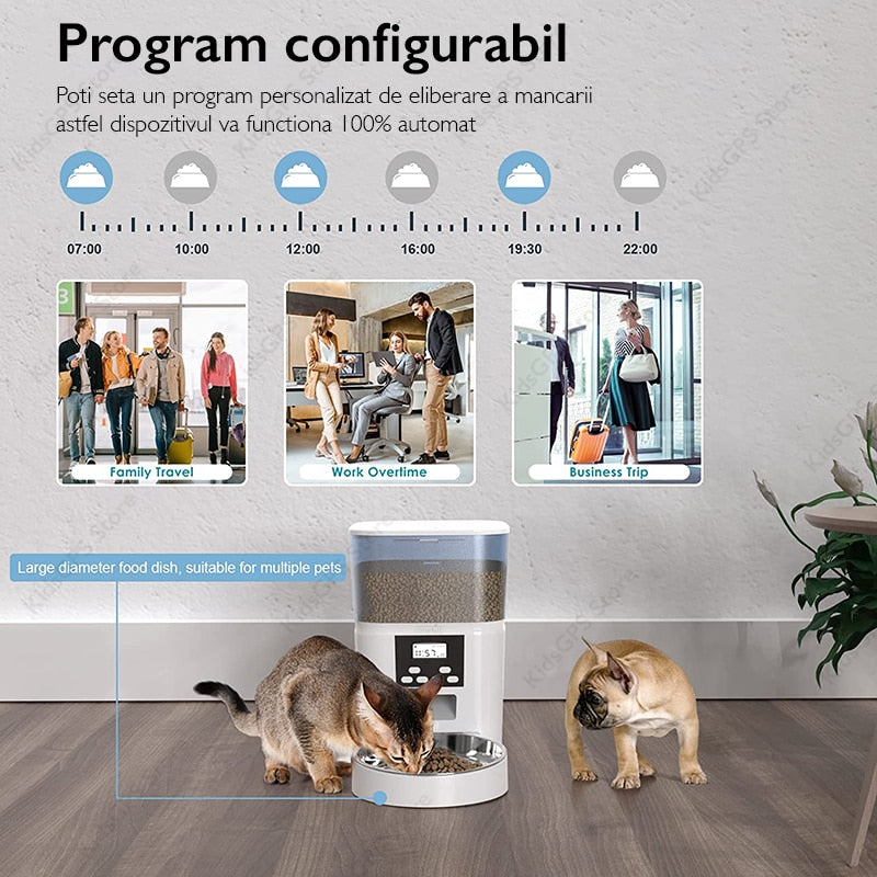 - Alimentare: priza sau baterii (pentru urgenta - pastreaza setarile si continua programul de hranire - NOTA: nu reprezinta o sursa principala de alimentare. Nu poate fi utilizat doar pe baterii)