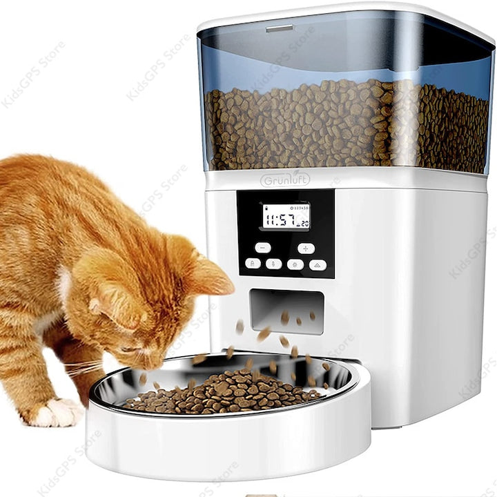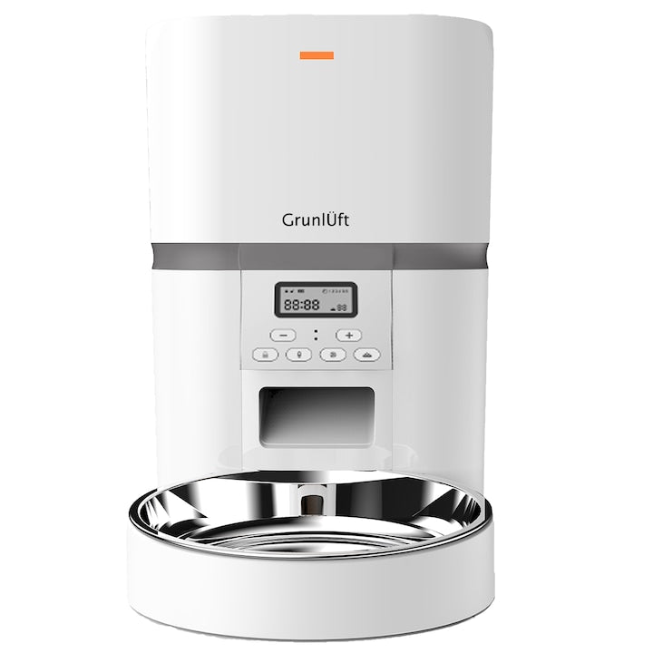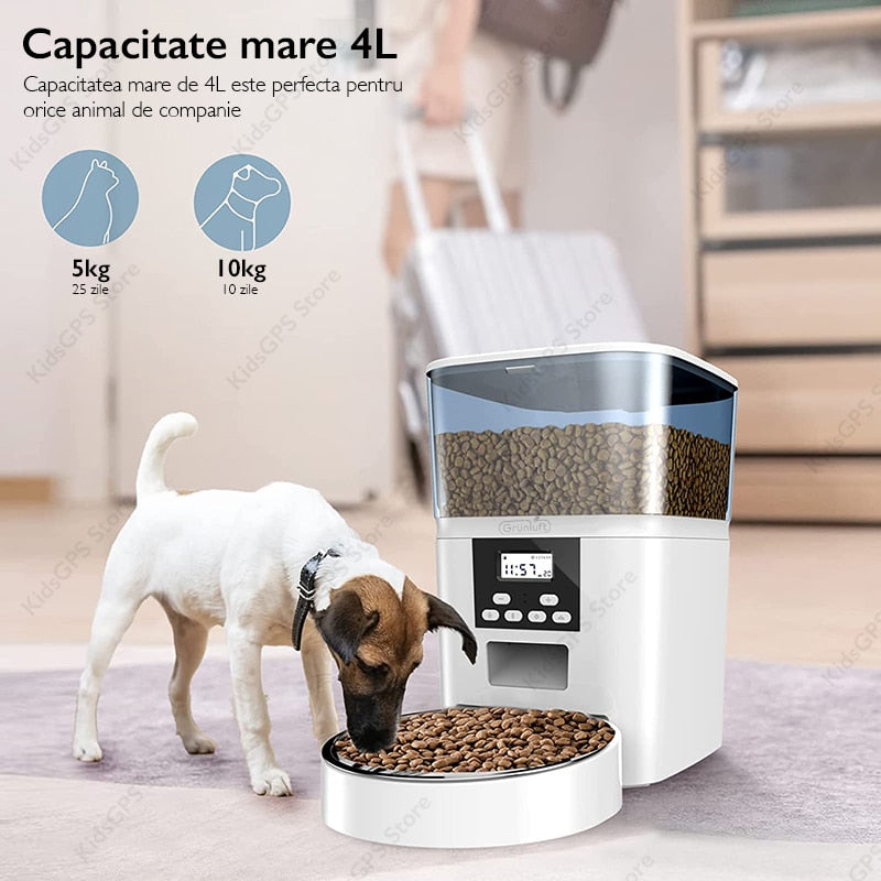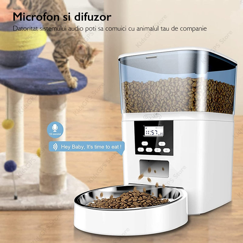 Hranitor automat Grunluft® QQ002, 4L, vas inox, functie dozator pentru caini sau pisici, functie adapator, sunet hranire, programabil, sursa alimentare dubla, alb