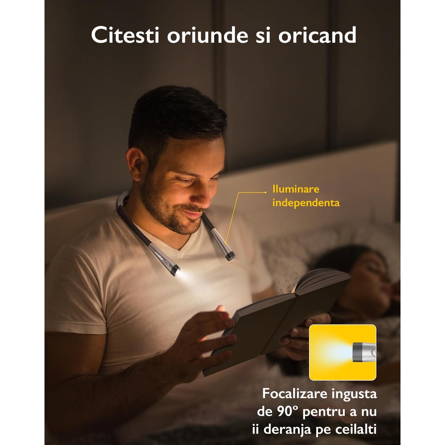 Descopera placerea de a citi in orice moment al zilei cu noua noastra lampa de gat Techone® Pro Reader. Conceputa special pentru pasionatii de lectura, aceasta lampa ofera flexibilitate, confort si protectie pentru ochi, transformand fiecare sesiune de citit intr-o experienta placuta si relaxanta. Fie ca esti acasa, in calatorie sau ai nevoie de o sursa de lumina suplimentara, Techone® Pro Reader este companionul ideal. Iata ce o face atat de speciala: