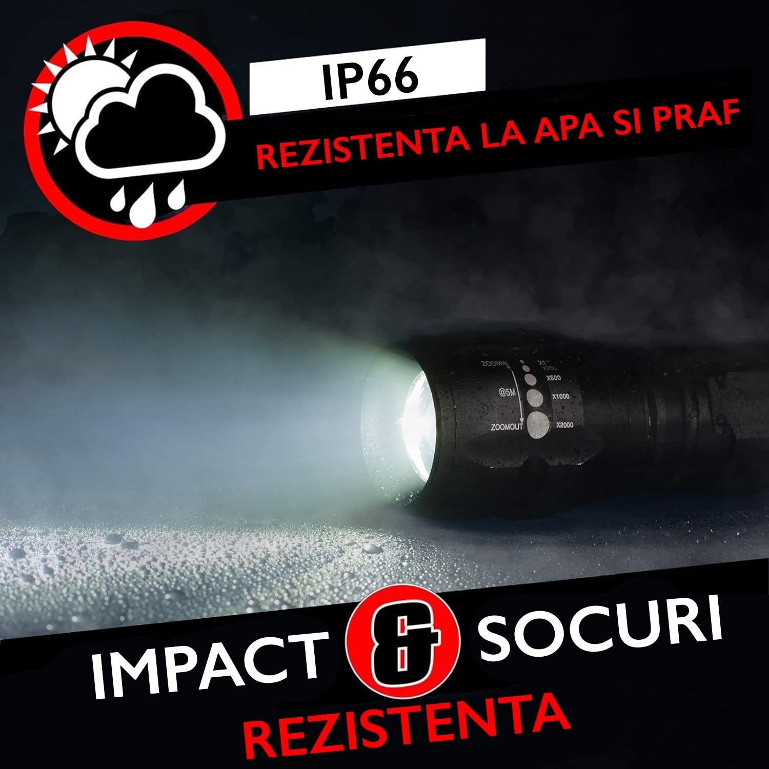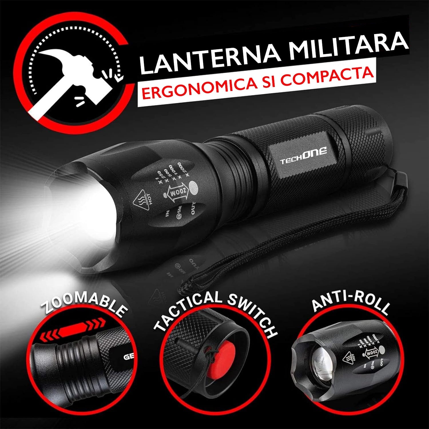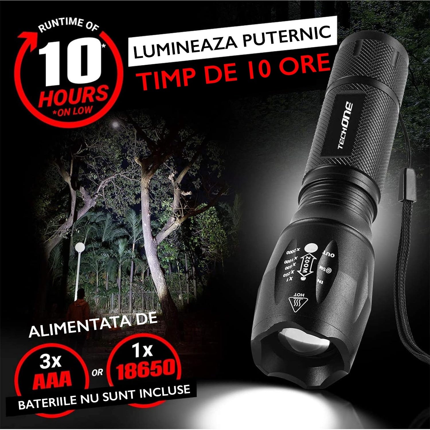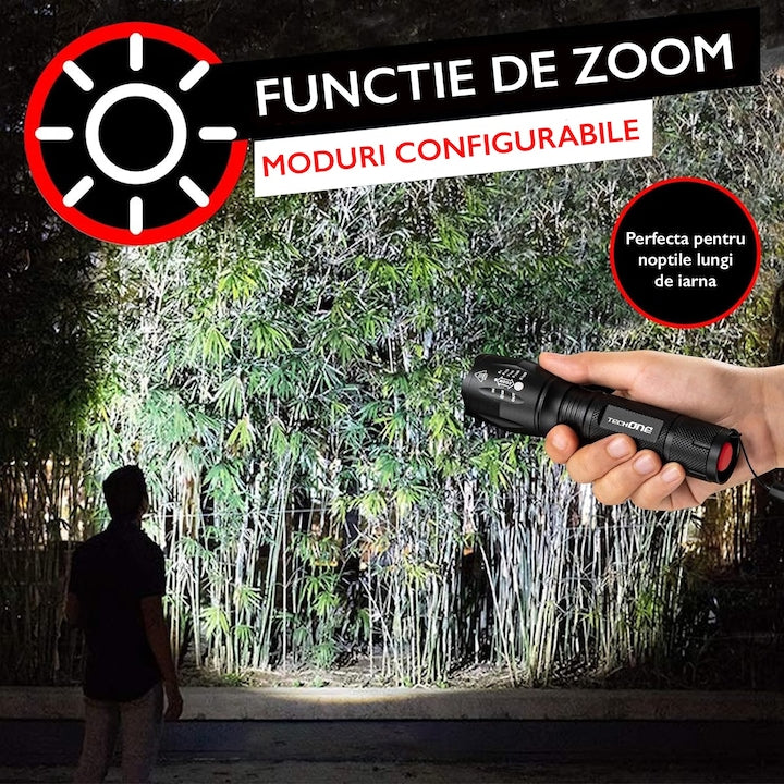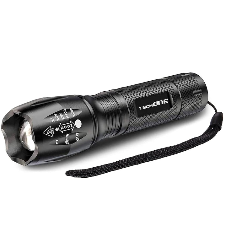 Lanterna LED Techone® Vision Pro, 1500 Lumeni, Din Aluminiu, 5 Moduri de Luminare, Rezistenta la Apa, Baterii sau Acumulator 18650, Zoom, Mod SOS Negru
