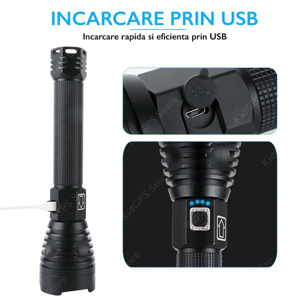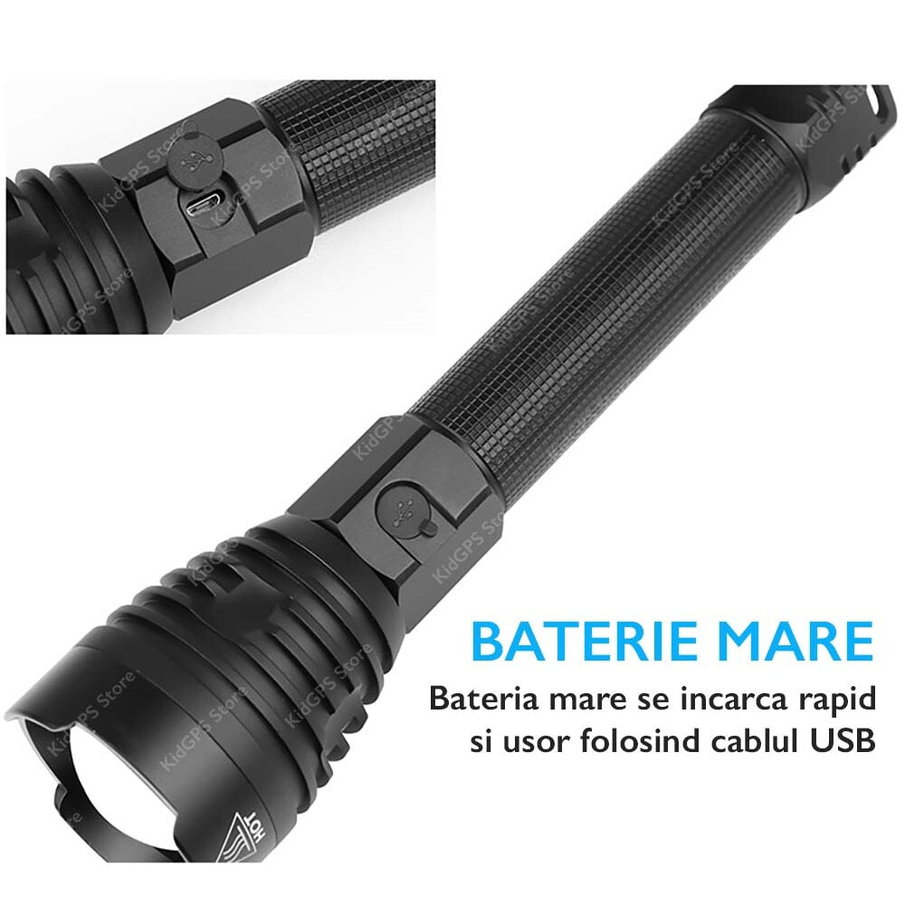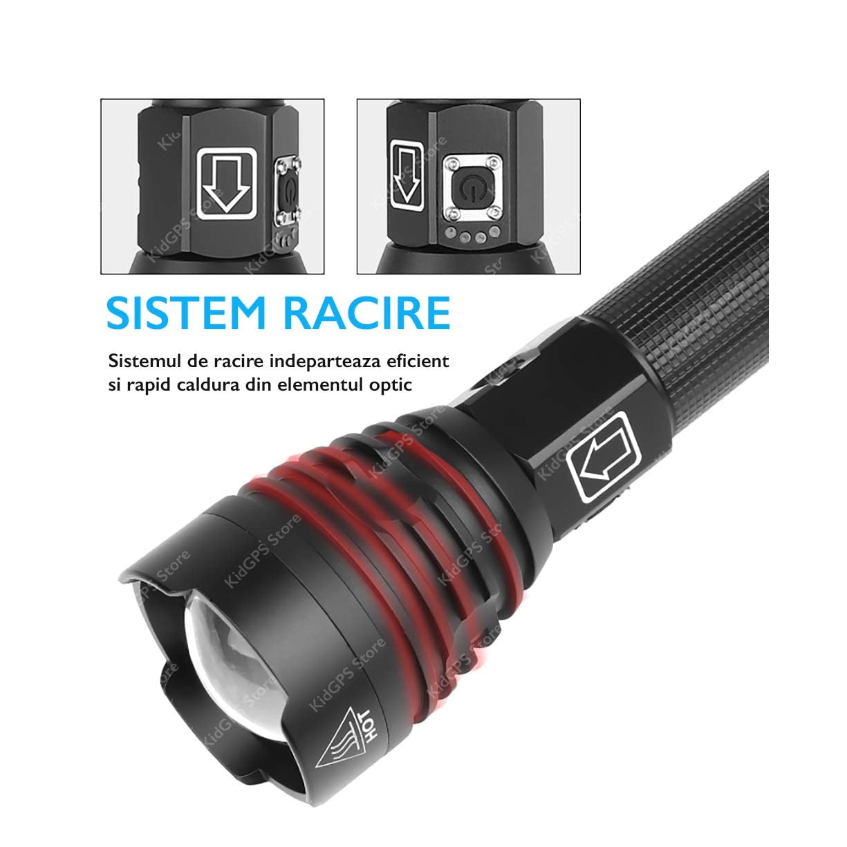 Lanterna tactica LED Techone® SK1905, din aluminiu, sursa XHP90 Ultra-Bright, profesionala, focus ajustabil, acumulator inclus, rezistenta la apa, incarcare USB, 6000 lumeni, 3 moduri lumina, negru