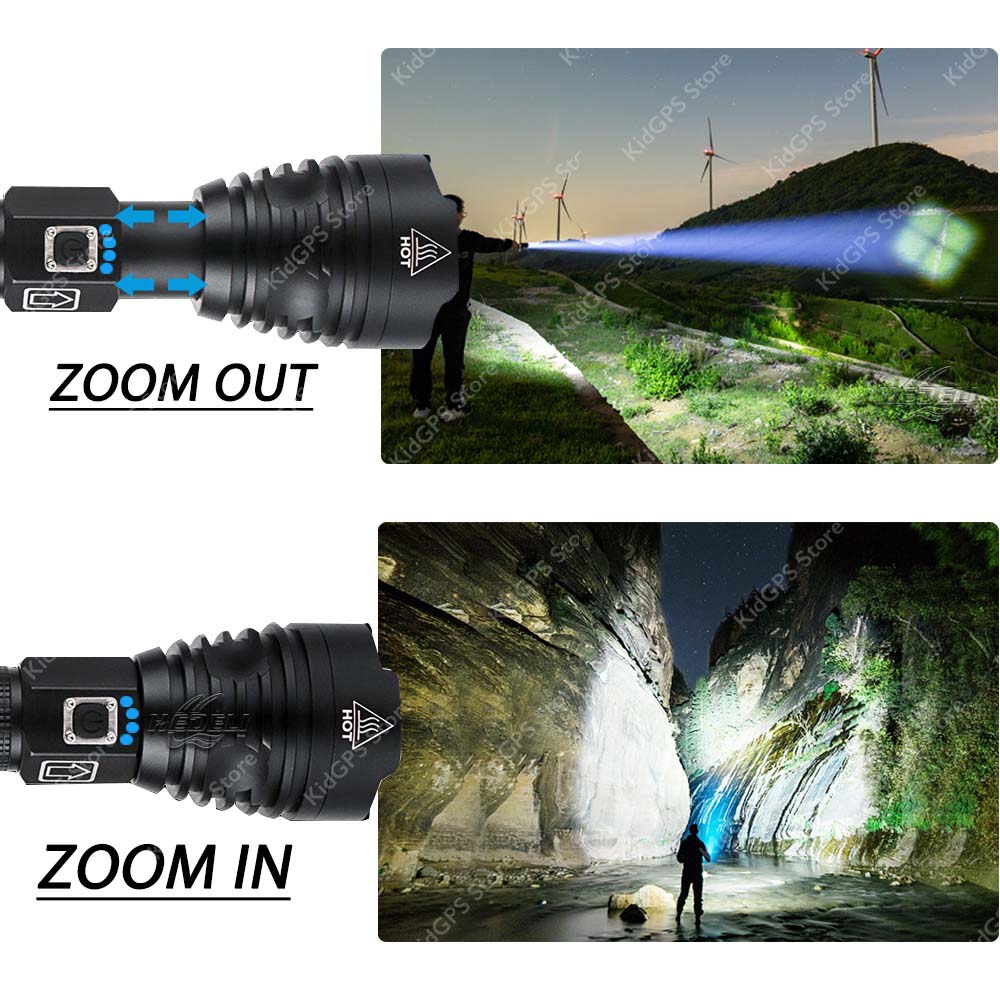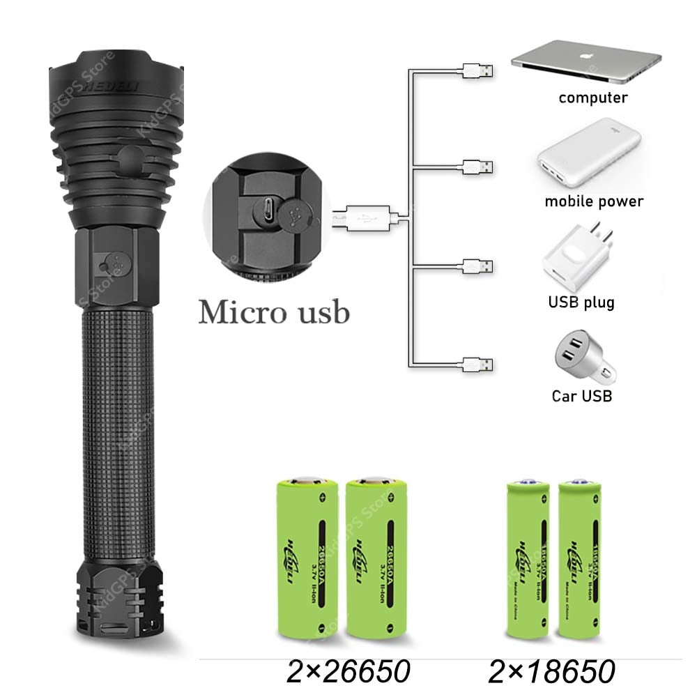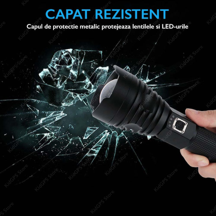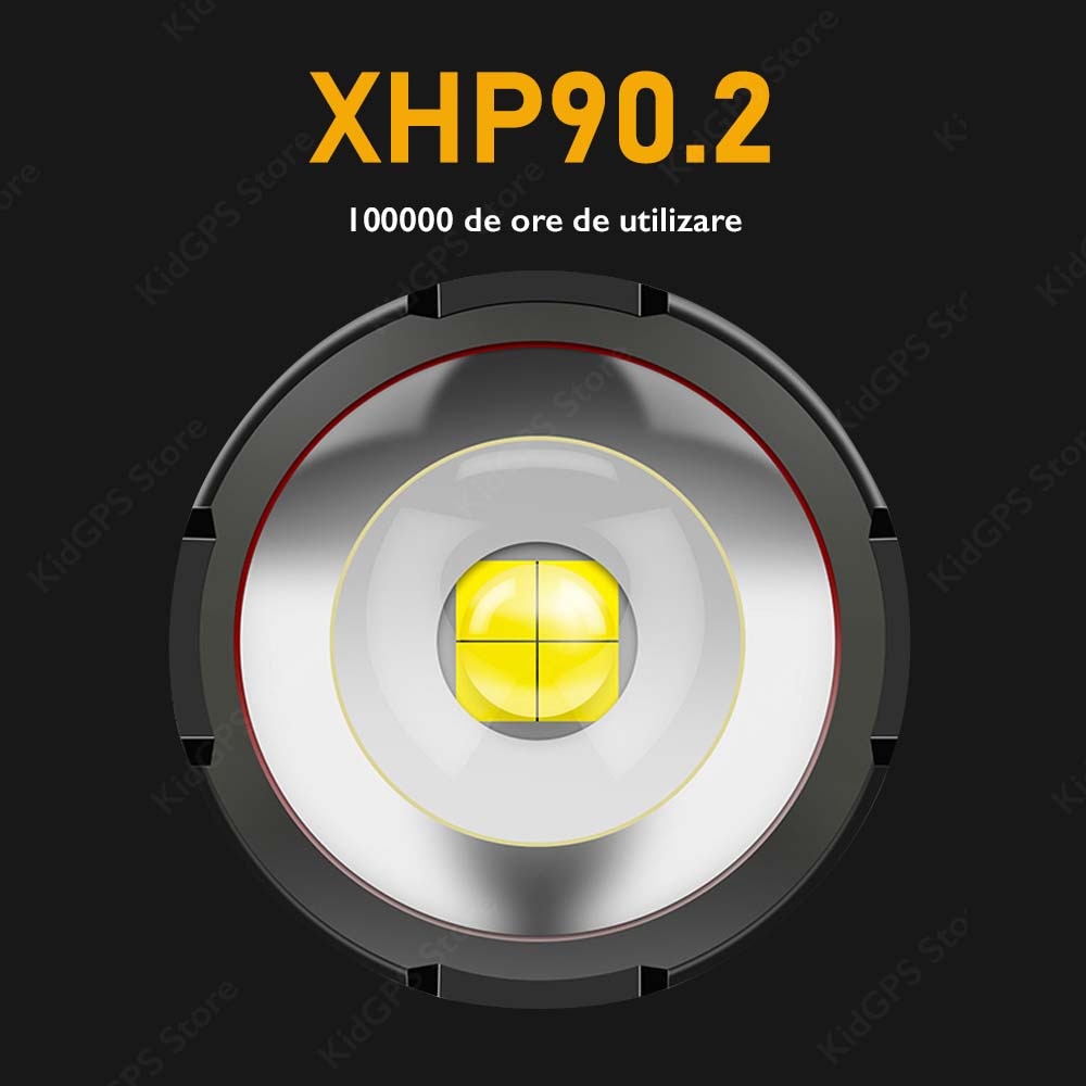 Lanterna tactica LED Techone® SK1905, din aluminiu, sursa XHP90 Ultra-Bright, profesionala, focus ajustabil, acumulator inclus, rezistenta la apa, incarcare USB, 6000 lumeni, 3 moduri lumina, negru