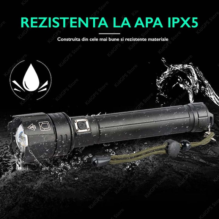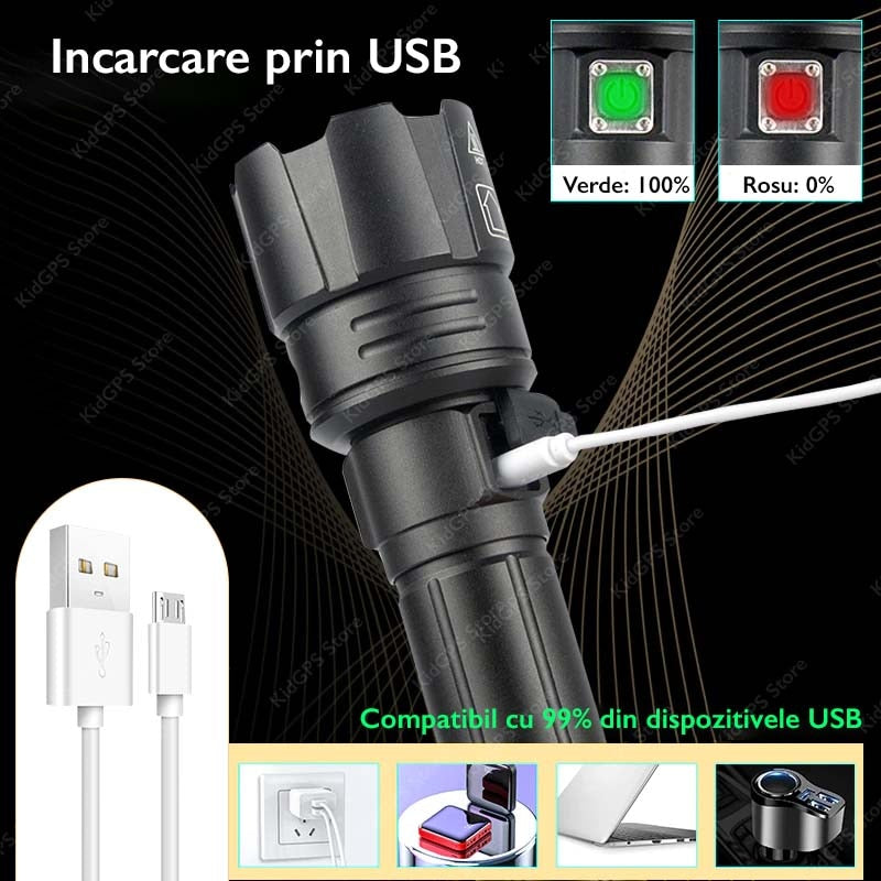 Lanterna tactica LED Techone® SK1910, din aluminiu, sursa XHP90 Ultra-Bright, profesionala, focus ajustabil, acumulator inclus, rezistenta la apa, incarcare USB, 5000 lumeni, 3 moduri lumina, negru