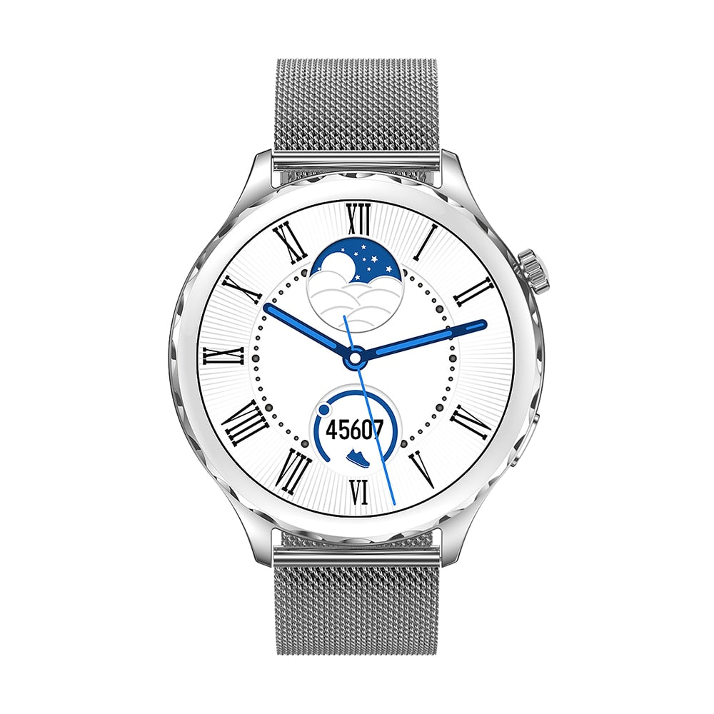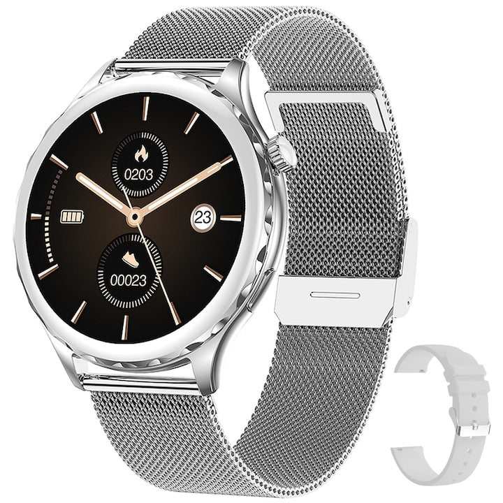 Smartwatch si bratara fitness TechONE® AK43 Diamond, pentru femei, 1.3 inch Retina IPS Full View, apel BT, monitorizare ciclu, ritm cardiac, oxigen, rezistent la apa ip67, vibratii, multi sport, silver