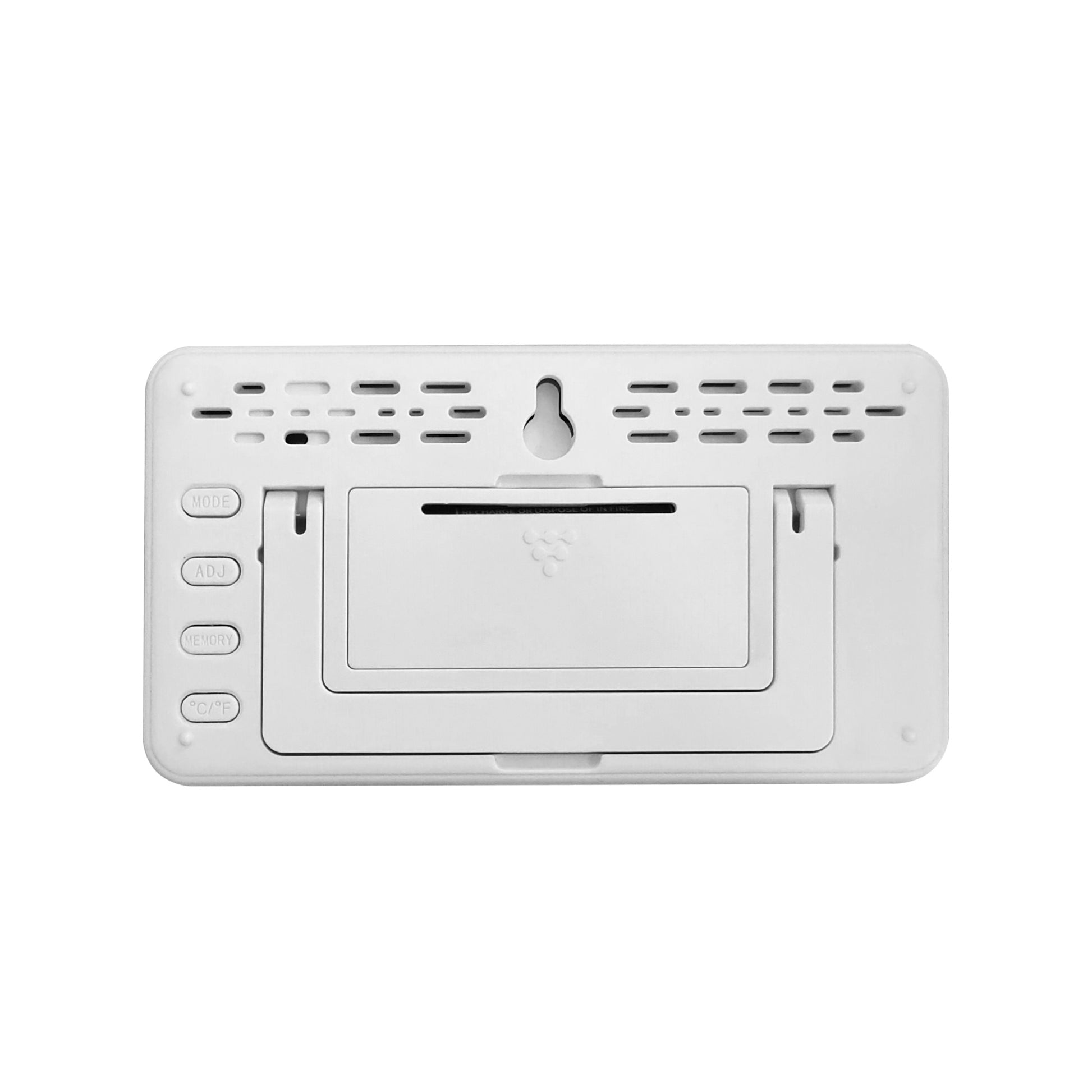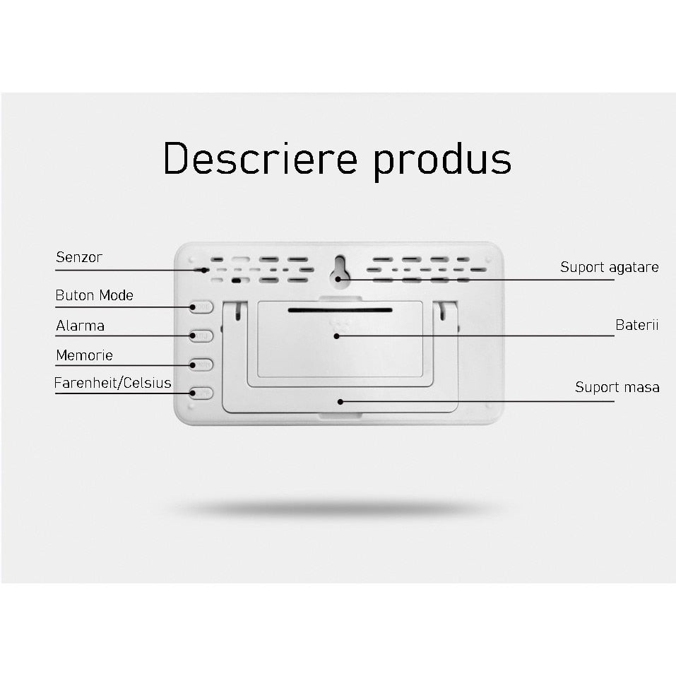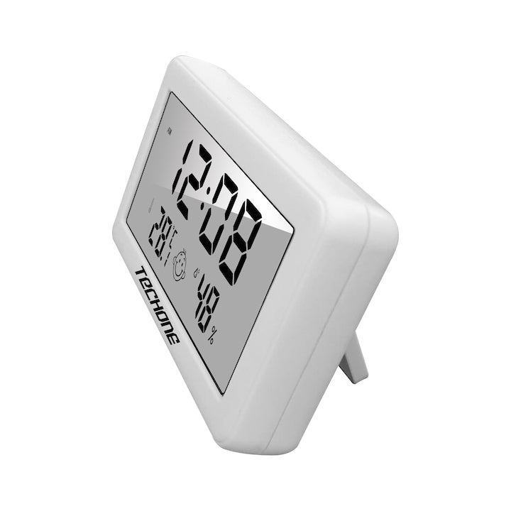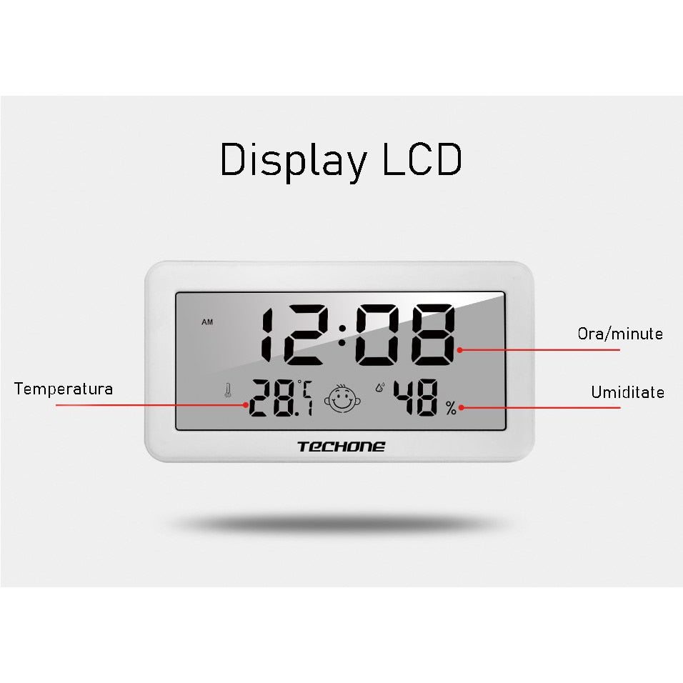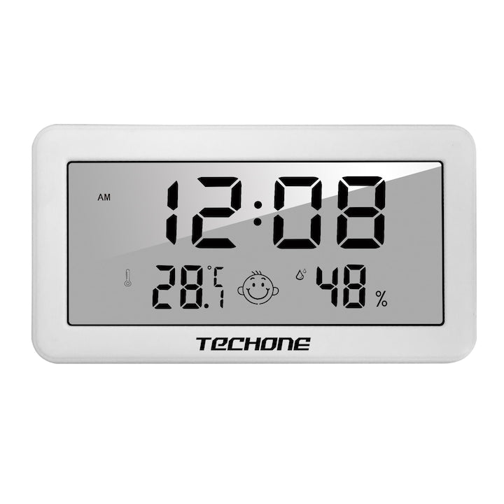 Termometru si higrometru de camera Techone® CX-1206, indicator comfort, citire 10s, afisare ceas si data, umiditate, gama profesionala, alarma, suport agatare sau stand, compact, alb